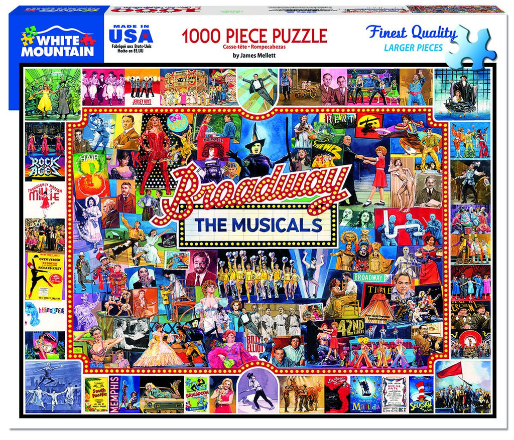 Artist Jim Mellett spent months painting this dazzling tribute to Broadway musicals. All the great shows are pictured here, including Rock of Ages, Thoroughly Modern Millie, Redhead, Hairspray, The Wiz, South Pacific, Memphis, Brigadoon, La Cage Aux Folles, Matilda, Kiss Me Kate, Seussical the Musical, Jersey Boys, Hair, Bye Bye Birdie, Billy Elliot, 42nd Street, Jesus Christ Superstar, Rent, Annie Get Your Gun, Mama Mia, Funny Girl, Camelot, Fiddler on the Roof, Cabaret, West Side Story, A Chorus Line, Oklahoma, Porgy & Bess, Phantom of the Opera, Springtime for Hitler, Godspell, Kinky Boots - and so many more for you to hum along to as you build this 1,000 piece puzzle. Finished size 24” x 30”.