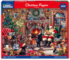 Santa sits by the fire reading letters written by kids from around the world, trying his best to ignore the playful puppy. His living room has been overrun by puppies awaiting their final homes. They are to become Christmas gifts and lifelong friends to good girls and boys. Artist P.D. Moreno created the perfect winter evening with Santa and his furry little friends in this 1000 piece jigsaw puzzle. Finished size 24" x 30".