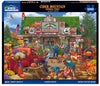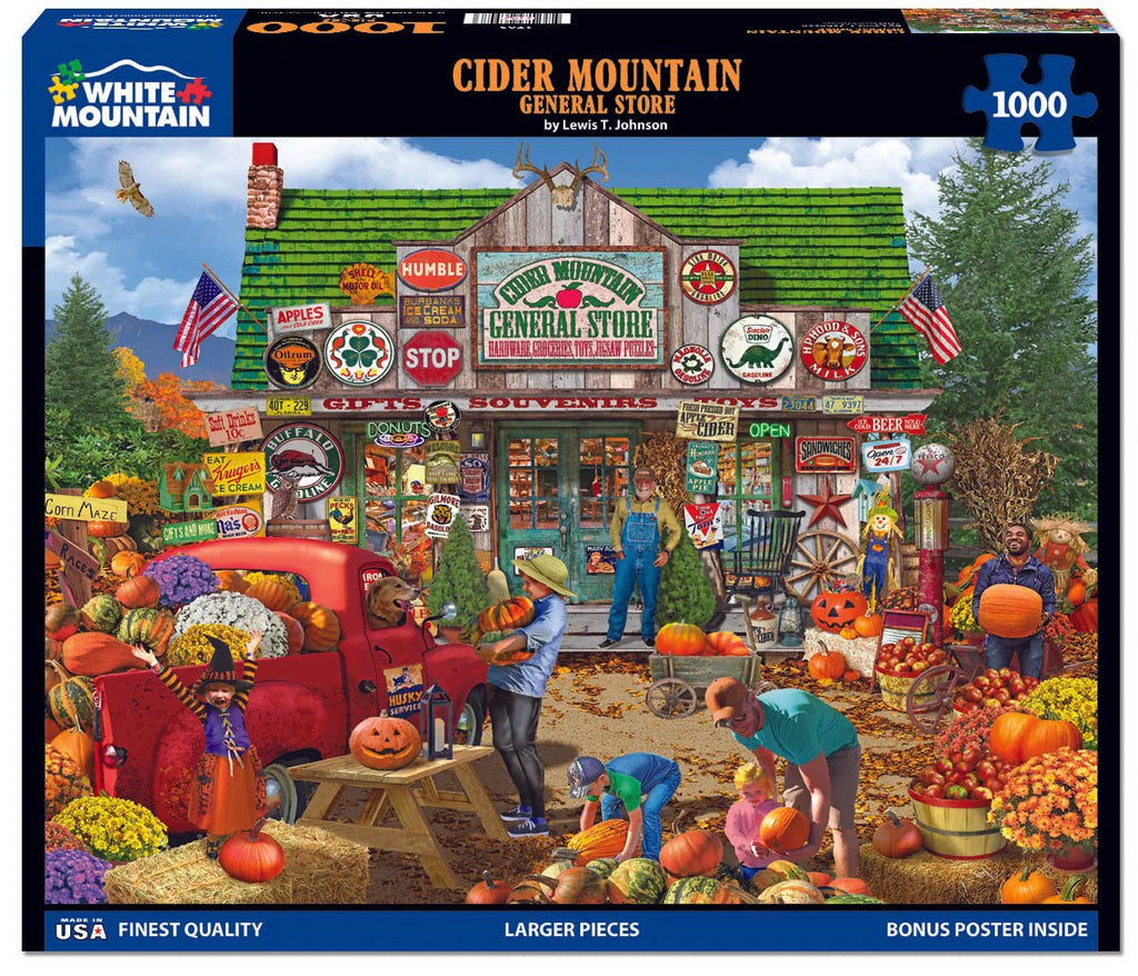 Its Autumn at Cider Mountain. The general store is decked out with everything Fall – pumpkins, scarecrows, apples, chrysanthemums and more. The store owner stands on the porch enjoying the scene families create as they pick out the perfect carving pumpkins. His trusty dog watches from his spot in the truck while an excited child displays her costume. Artist Lewis T. Johnson brings us all the joys of Autumn in this 1000 piece jigsaw puzzle. Finished size of 24” x 30”.