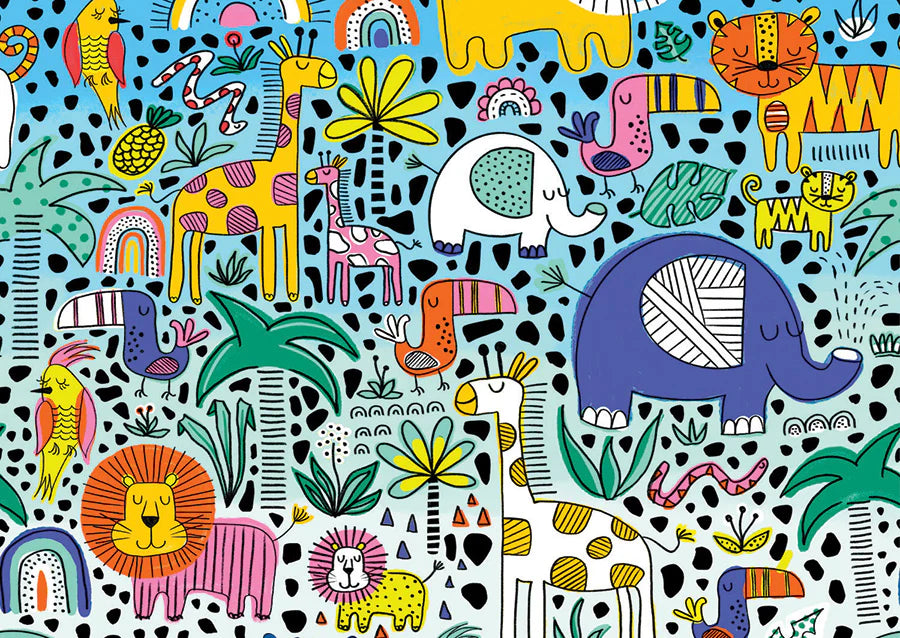 A jungle of whimsical creatures and playful patterns brings this safari doodle to life. With every twist and turn, this puzzle reveals a wild and imaginative world waiting to be explored. Piece together lions, elephants, tigers, toucans, giraffes and more!