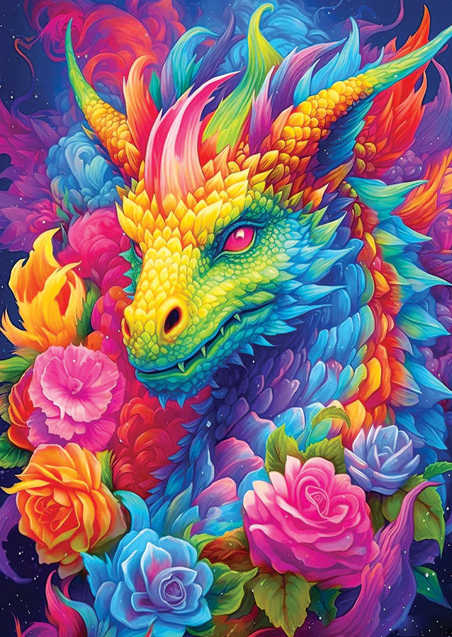 A dragon painted in every color of the rainbow - its fierce, fiery, and full of untamed magic.