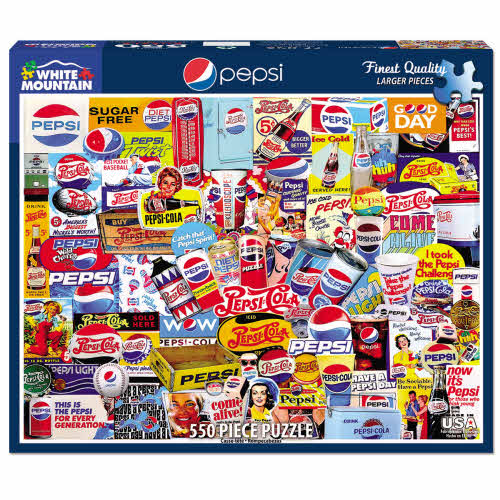 Sugar-free, Twist, Throwback, Diet, Light, or Wild Cherry – take the Pepsi Challenge and quench your thirst with the tempting assortment on this 550 piece puzzle. Vintage images go back to the good old days of the 5 cent bottle and the promotional thermometer. This puzzle designed by Charlie Girard has a finished size of 18” x 24”.