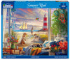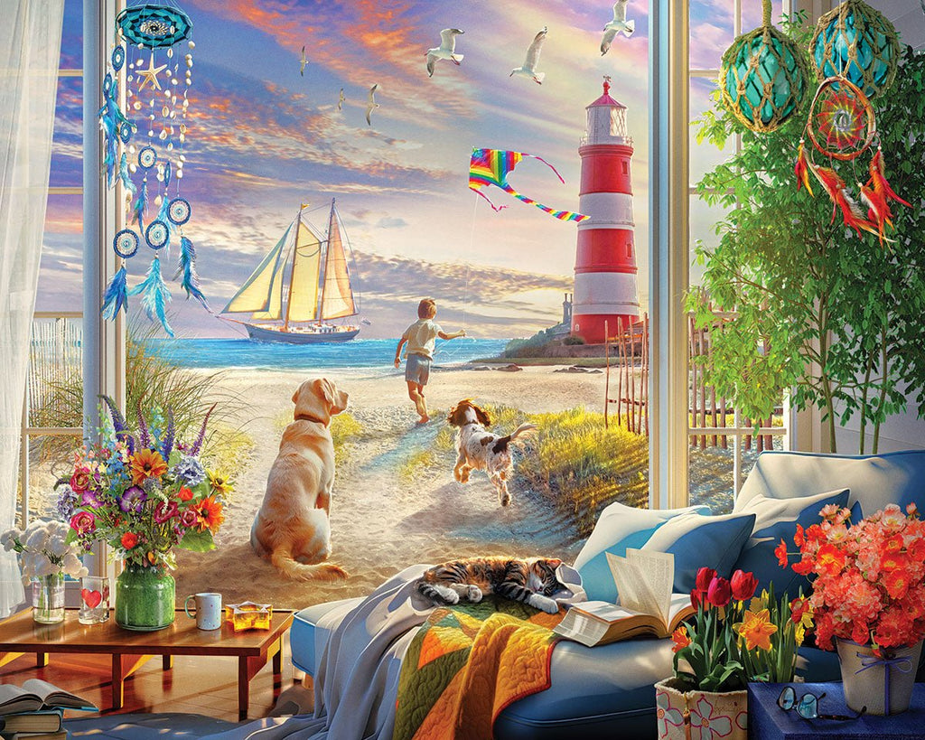 Sitting back relaxing with a book in one hand and petting the cat with the other. The sweet sounds of a little boy running on the warm sand flying his kite and the dog happily chasing after him. Artist Angelo Bonita created an image that can invoke memories with this 500 piece jigsaw puzzle. Finished size of 18” x 24”.