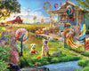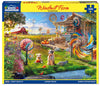 It’s a beautiful sunny day on the farm. The dogs are outdoors paying by the pond while birds fly overhead cutting a path through the clear blue sky. Decorative windmills can be spotted on the fence, the house, and in select places in the yard adding color pops of color and movement. Orange and yellow and pink and blue twist and turn and melt together at the whim of the breeze. Artist Angelo Bonito brings a windmill farm to you in this 500 piece jigsaw puzzle. Finished size of 18” x 24”.