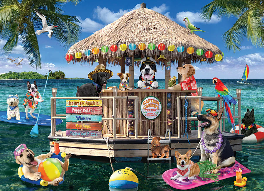 Welcome to Captain Canine’s Snacks and Beverages, if you’re a hot dog, its got everything to help you cool down including Pupsicles and Puppy Coladas. Artist Bob Giordano combines illustration and photos to create busy puzzle experiences. He created many of Cobble Hill's bestselling dog images, including Choc Wagon, Christmas Puppies, and Wanderlust.