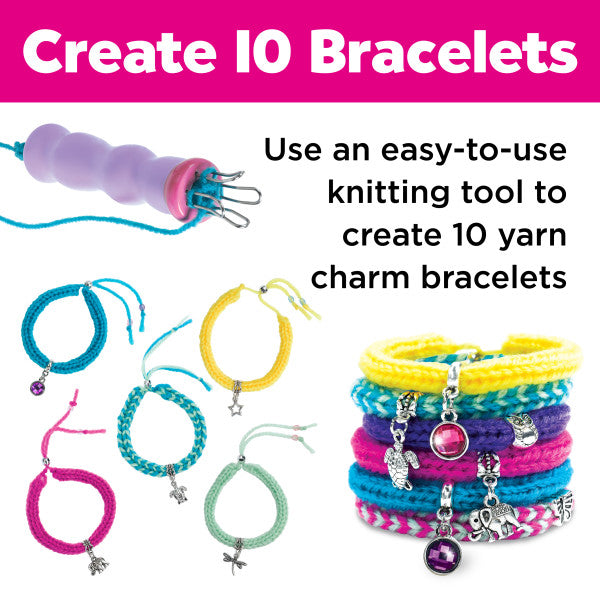 Learn traditional knitting spool technique to create 10 colorful yarn & charm bracelets to wear & share. Your complete set includes an array of colorful yarn, knitting tool and fashion-forward charms.