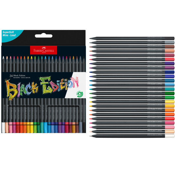 Black Edition Color Pencils with black wood and supersoft leads have great effects on light and even colored and dark paper. Pure Color! The brilliant colors have an extra-smooth color laydown. The color pencils have an ergonomic triangular shape that ensures the correct grip position for optimum comfort while drawing. Due to Faber-Castell's SV bonding process, the pencils are break-resistant. The eco pencils are made of wood from certified sustainable forestry. Comes packaged in a cardboard box.