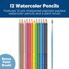 Contents: 12 Pencils: Black, Blue, Turquoise, Green, Lime Green, Yellow, Orange, Red, Purple, Peach, Brown and Grey and 1 paint brush