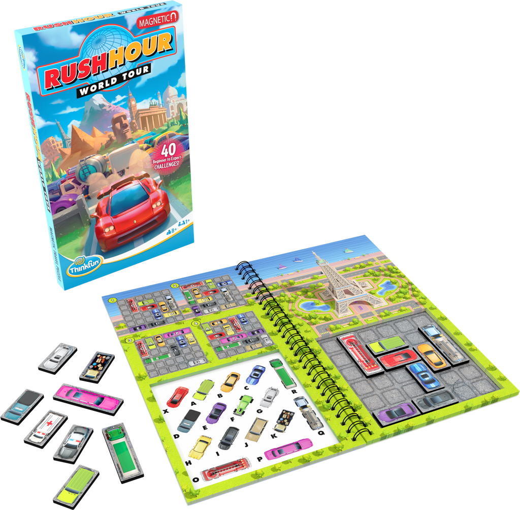Take all the fun of Rush Hour all around the world! As you travel to your next destination, explore the major monuments and wonders of the world as you guide the red car out of the traffic jam. Enjoy amazing illustrations of historic locations as you play through the Rush Hour experience with the magic of magnets. With 40 challenge cards of increasing difficulty, kids will be engaging their brains on every car, plane, and train ride to new places.