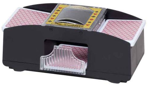 2 deck plastic card shuffler, requires 2 C size batteries not included. Depending on the type of playing cards may have to shuffle one deck at time.