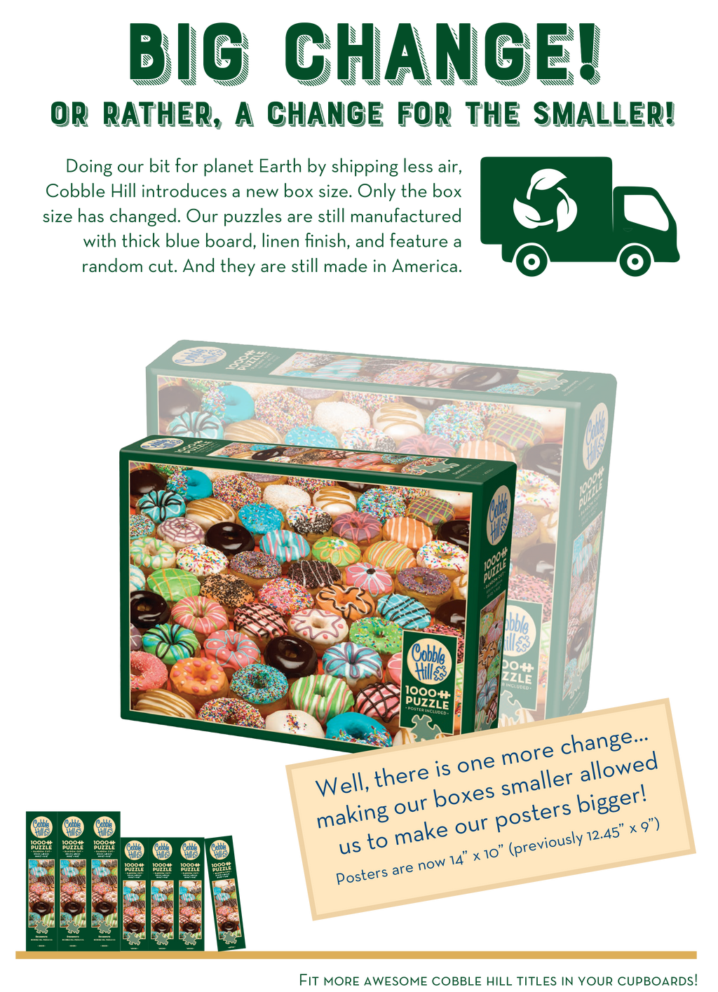 Doing our bit for planet Earth by shipping less air, Cobble Hill introduces a new box size. Only the box size has changed. Our puzzles are still manufactured with thick blue board, linen finish, and feature a random cut. And they are still made in America. Well, there is one more change… making our boxes smaller allowed us to make our posters bigger! Posters are now 14” x 10”