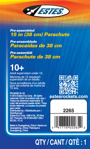 This 15 in. (38 cm) parachute is preassembled and ready to use on model rockets that require a 15 in. parachute.
