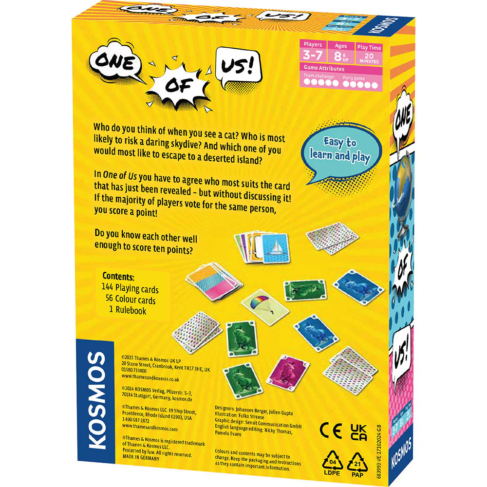 A cooperative party game of conjecture and laughs. Who do you think of when you see a cat? Who would best wear a daredevil parachute jumpsuit? And who of you would prefer to disappear to a desert island? In One of Us, you have to agree on which player you most associate with the card you’ve just turned over — and without discussing it! If the majority point to the same person you score a point. Can you manage to be on the same wavelength and score ten points?