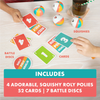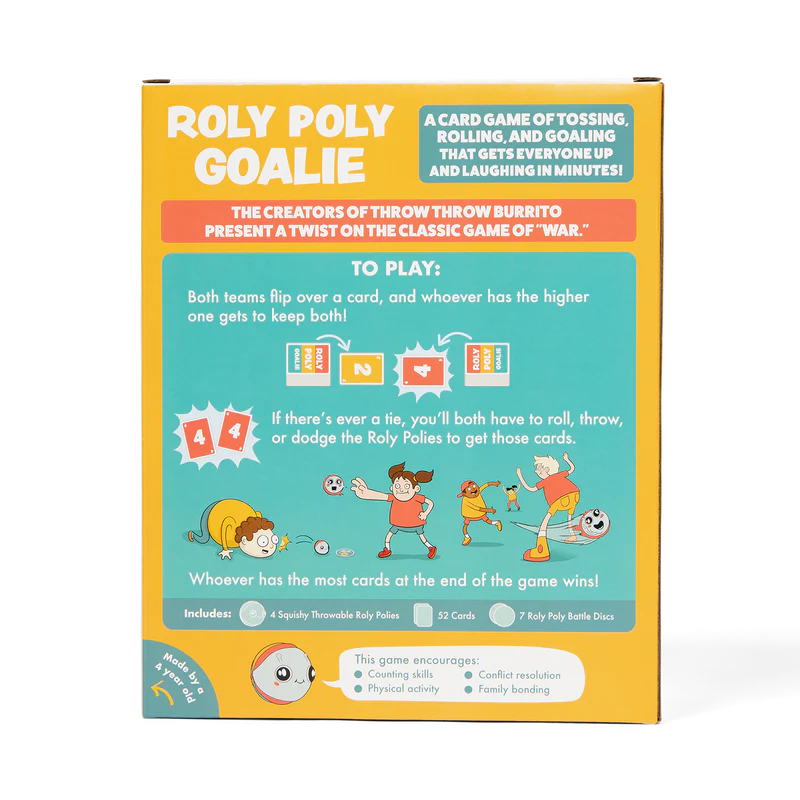 Both teams flip over a card and whoever has the higher one gets to keep both. If there’s a tie, you’ll both have to roll, throw, or dodge the soft, adorable Roly Polies to get those cards. Whoever has the most cards at the end of the game wins. It’s part carnival game, part kids card game, all screen free fun that even grown-ups will enjoy.