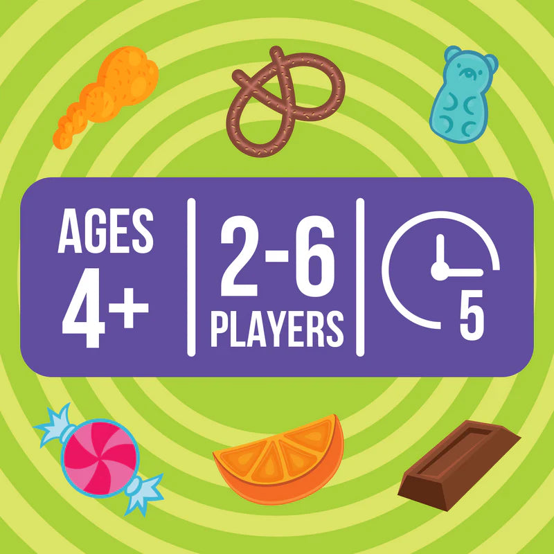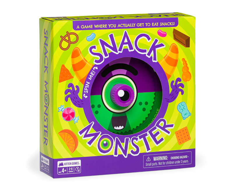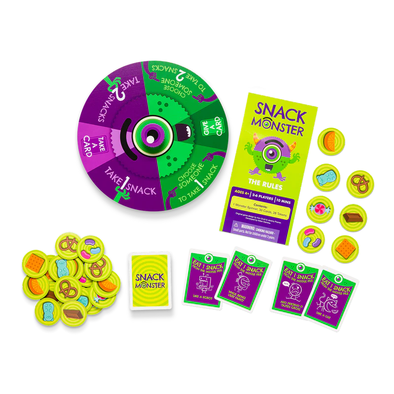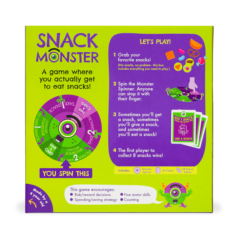 First, grab your favorite snacks (if you don’t have any on hand use the Snack Tokens in the box). Next, spin the Monster Spinner, anyone can stop it at any time. Sometimes you’ll get a snack, sometimes you’ll give a snack, and sometimes you’ll eat a snack. The first player to collect 8 snacks wins! Snack Monster secretly encourages fine motor skills, critical thinking, and counting practice.