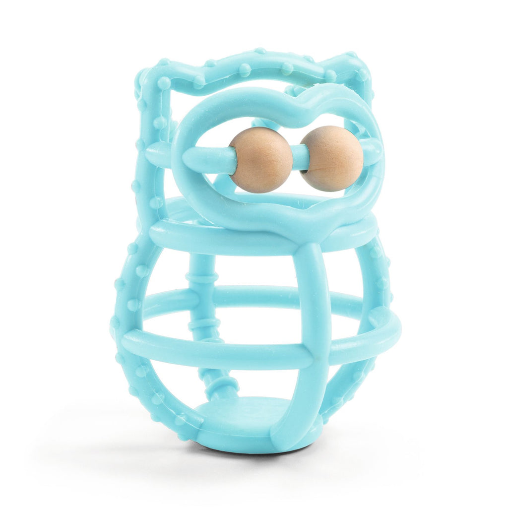A soft silicone owl-shaped teether with two natural wooden eyes.