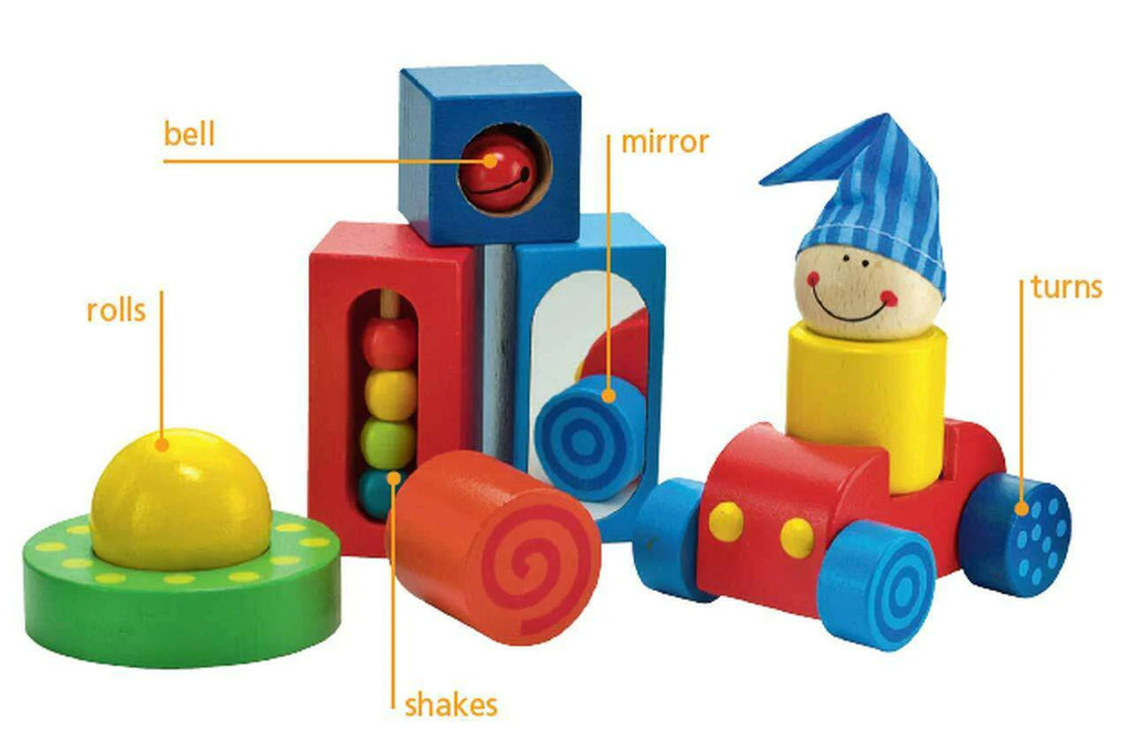 Let this wonderful set be your little one's very first introduction to the world of building blocks! Each intriguing piece is rounded at the edges and vibrantly colored. Six different building blocks each with its own surprise, acoustic or visual, for playing, building and discovering. Includes buggy with driver for pretend play.