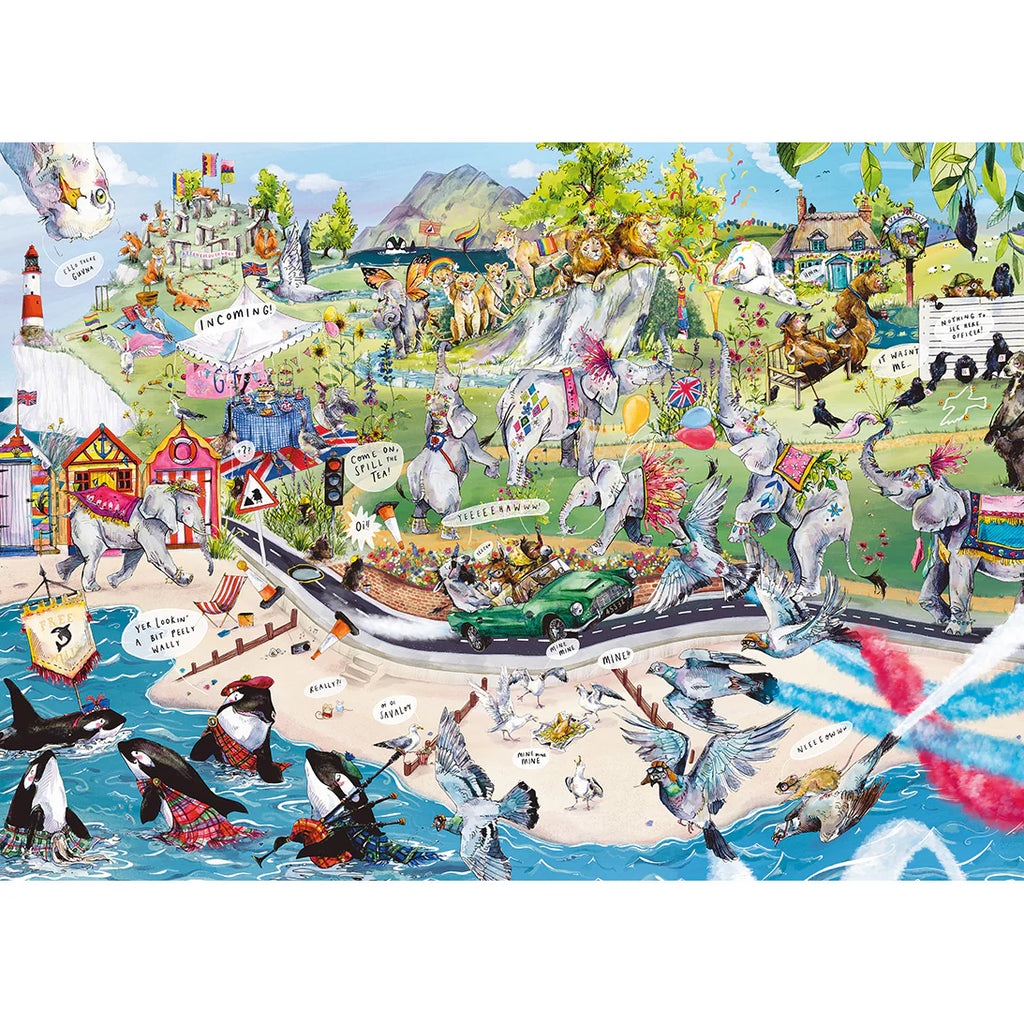On this lovely summer's day, can you spot the 12 collectives? Why are the bears investigating the crows? What are the Owls doing at Westminster? Piece together this comical jigsaw and work out the names of each collective of animals by way of visual pun!