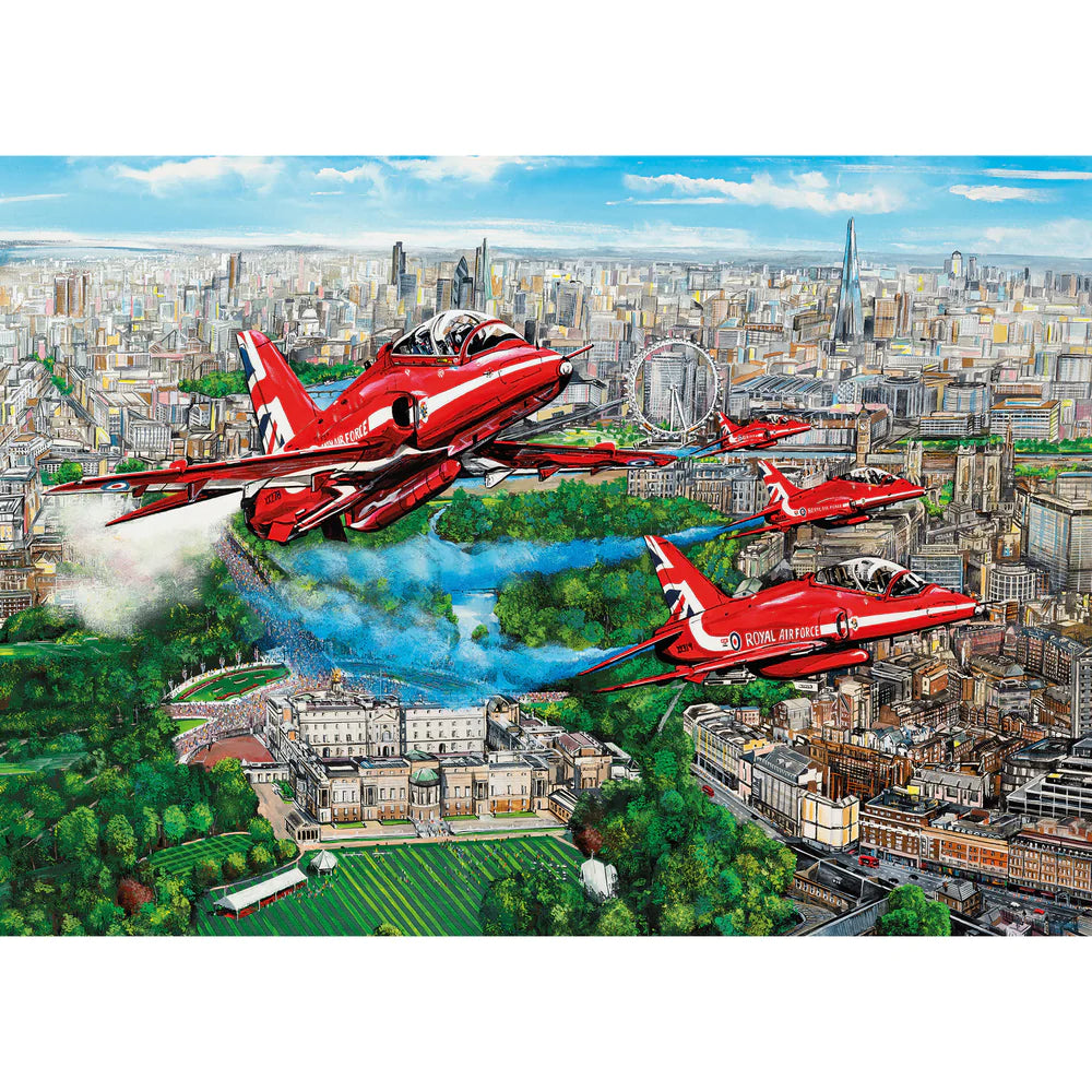 They also play their part in commemorating Royal and Military occasions with a Flypast over Buckingham Palace. These include the Queen's birthday, Royal weddings and British Military events such as Trooping the Colour. All nine jets take part in a Flypast and in this scene four jets are in view from the right side of the formation.
