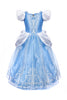 Bring the magic of the ballroom to life with the Once Upon a Princess Cinderella Dress. Crafted with soft blue fabric and dreamy white accents, this gown is fit for royalty. Puffy white sleeves add a classic touch, while elegant white draping on each hip flows like a true princess's gown. Intricate swirling designs decorate the bodice and skirt hem, and a sparkling silver jewel at the neckline completes the enchanting look.