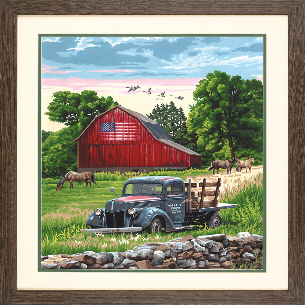 Horses wander freely around a barn and vintage truck in Summer Farm from PaintWorks by Dimensions. Finished size: 16" x 20". © GREG & COMPANY, LLC. All Rights Reserved. www.Greggiordanoart.com. Kit contains high-quality acrylic paints, printed art board, paintbrush, and easy instructions.