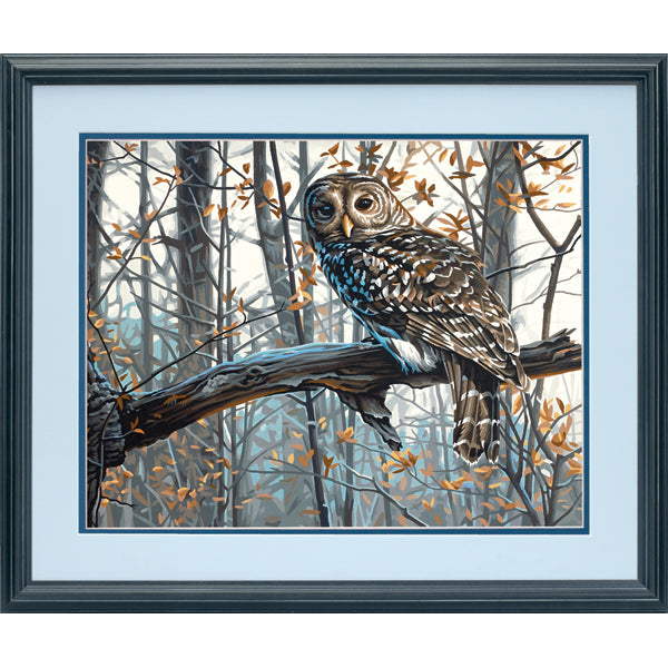 Tucked deep in the woods and well camouflaged, this Wise Owl surveys his surroundings, alert for prey. This paint by number design is perfect for wildlife enthusiasts. Finished Size: 14" x 11" (36 x 28 cm). Kit contains high quality acrylic paints, pre-printed textured art board, a paintbrush, and instructions. If you prefer to work with a variety of brushes, we recommend a liner brush for fine-line detail and a #4, 6, or 8 flat brush for larger, open areas. Designer: Russell Cobane.