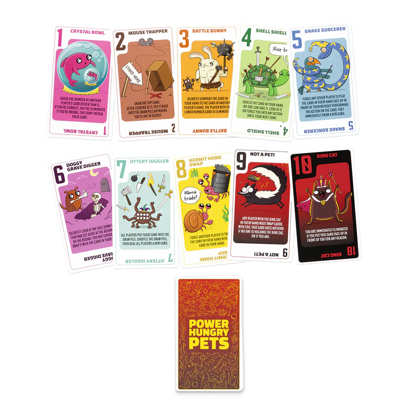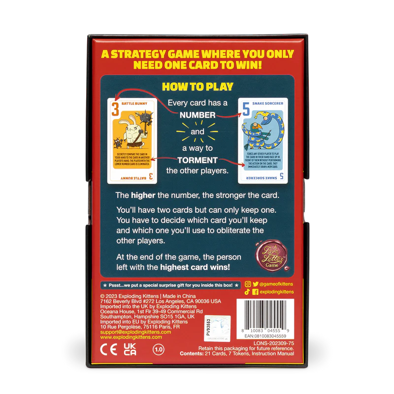 Every card has a number and a way to torment the other players. The higher the number, the more vicious the card. You only have two cards, so decide which to keep and which to use to backstab, steal from, or obliterate the other players. That’s right, you only ever need to make one choice at a time–it’s a breeze…until it isn’t! In the end, the person left with the highest card wins!