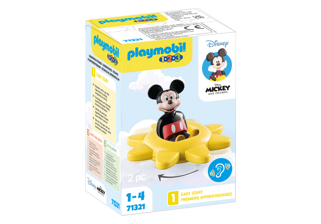 Mickey's Spinning Sun with Rattle Feature is the starter set for the youngest fans of the corresponding PLAYMOBIL 1.2.3 product line inspired by Disney’s Mickey Mouse. It playfully develops fine motor skills. The built-in rattling sound catches the curiosity of little explorers.