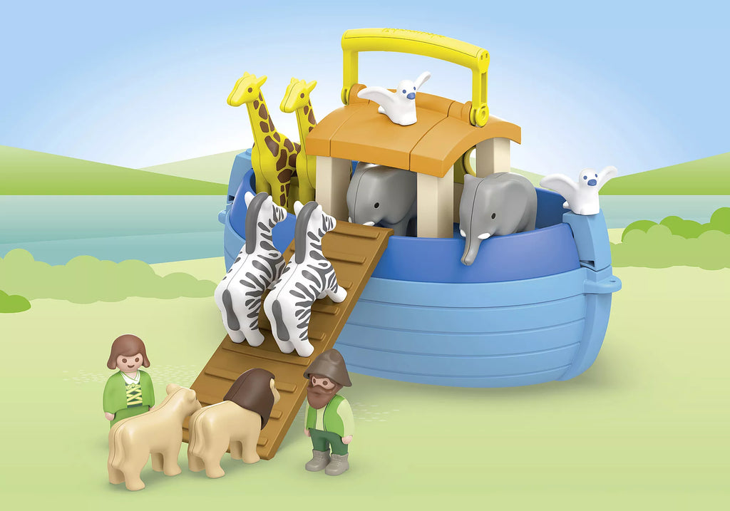 What a massive ship! Noah and his wife built an ark – and here there's room for all the animals. With this set, your child learns the impressive story of Noah's Ark and gets to know the diverse animal kingdom through play and fun. As the rain starts pouring and the water rises, Noah and his wife load the animals onto their ark in pairs. One by one, the animals board the ship via the ramp. Who goes where? How do the giraffes fit under the roof? Heroically, Noah and his wife save all the animals – but are all the pairs complete? Where will the ship's guests find a new home now? Your child surely has an idea in mind already! Fun on the go: The ark is a practical box that fits all the set's accessories. With the carrying handle, your child can now take their ark and its inhabitants everywhere!