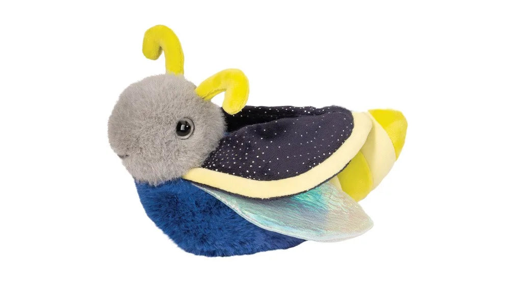 A summer’s night wouldn’t be complete without the magic of little glowing lights filling the air! Our Firefly stuffed animal, Flint, adds his own spark to the evening! Flint’s tail features alternating bands of yellow to represent the famous glowing abdomen of the Lightning Bug. Richly colored navy blue plush materials make up the rest of his body, while special fabrics bring intrigue to his wings. These have been depicted with graceful transparent materials that boast an iridescent shine. Gold speckles patterning Flint’s wing covers will catch your eye and bring to mind a star filled night. Throw your cares away and let Flint the plush Firefly magic you away on an evening of wonder and enchantment!