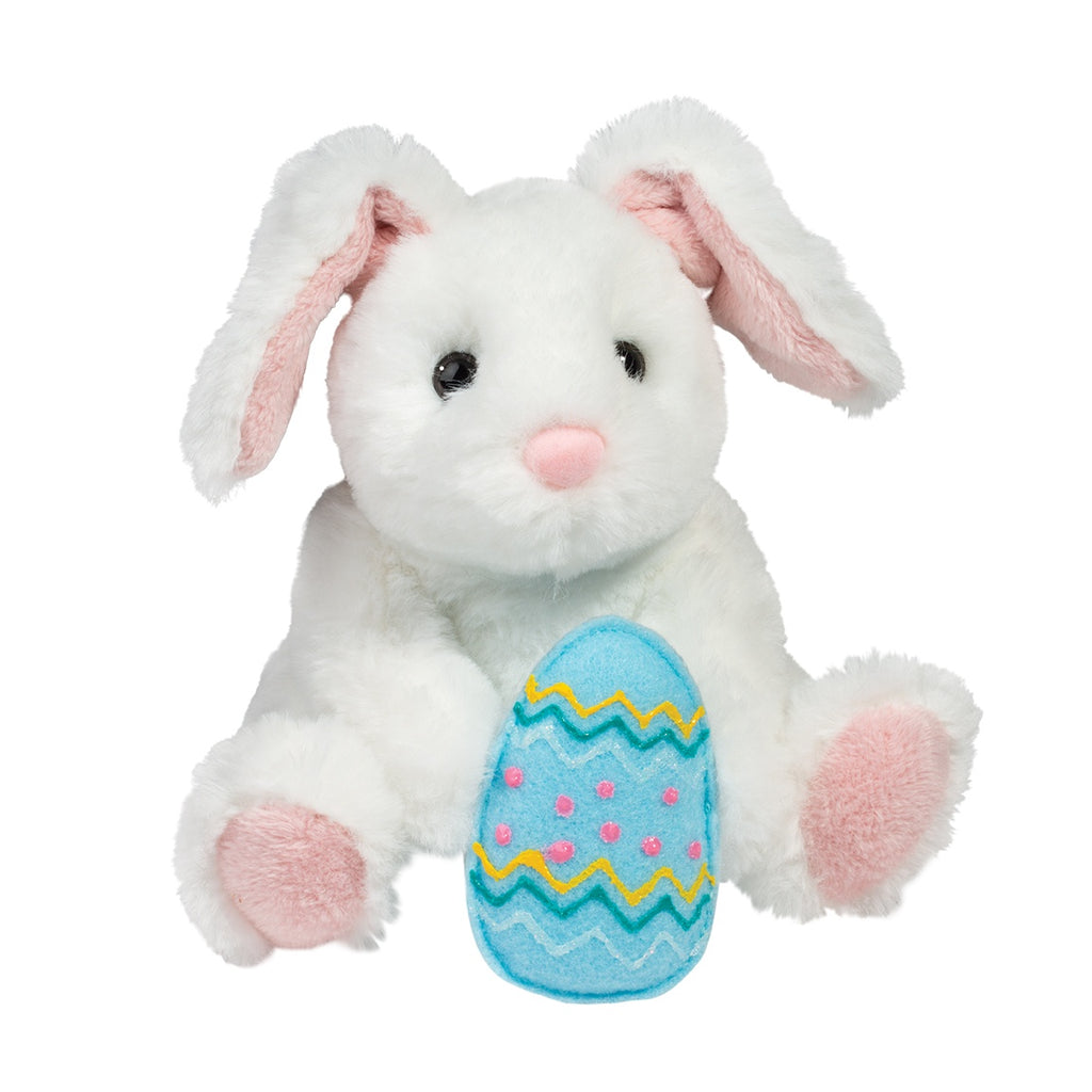 You won’t catch Rosie the plush Bunny missing out on celebrating the springtime season! Designing Easter Eggs is her absolute favorite thing to do this time of year. With zig zag stripes, polka dots, and an assortment of pastel colors, there’s no end to the creativity of egg decorating and that’s what Rosie loves best! This endearing Bunny stuffed animal features soft, white fur detailed with pink accents on her feet, nose, and ears. Rosie’s bright expression reveals her passion for spring and she holds a sky blue felt Easter egg that shows off her handiwork. Give this adorable mini plush rabbit a place in your décor or place her in a basket amongst the chocolates and eggs and watch the smiles abound!