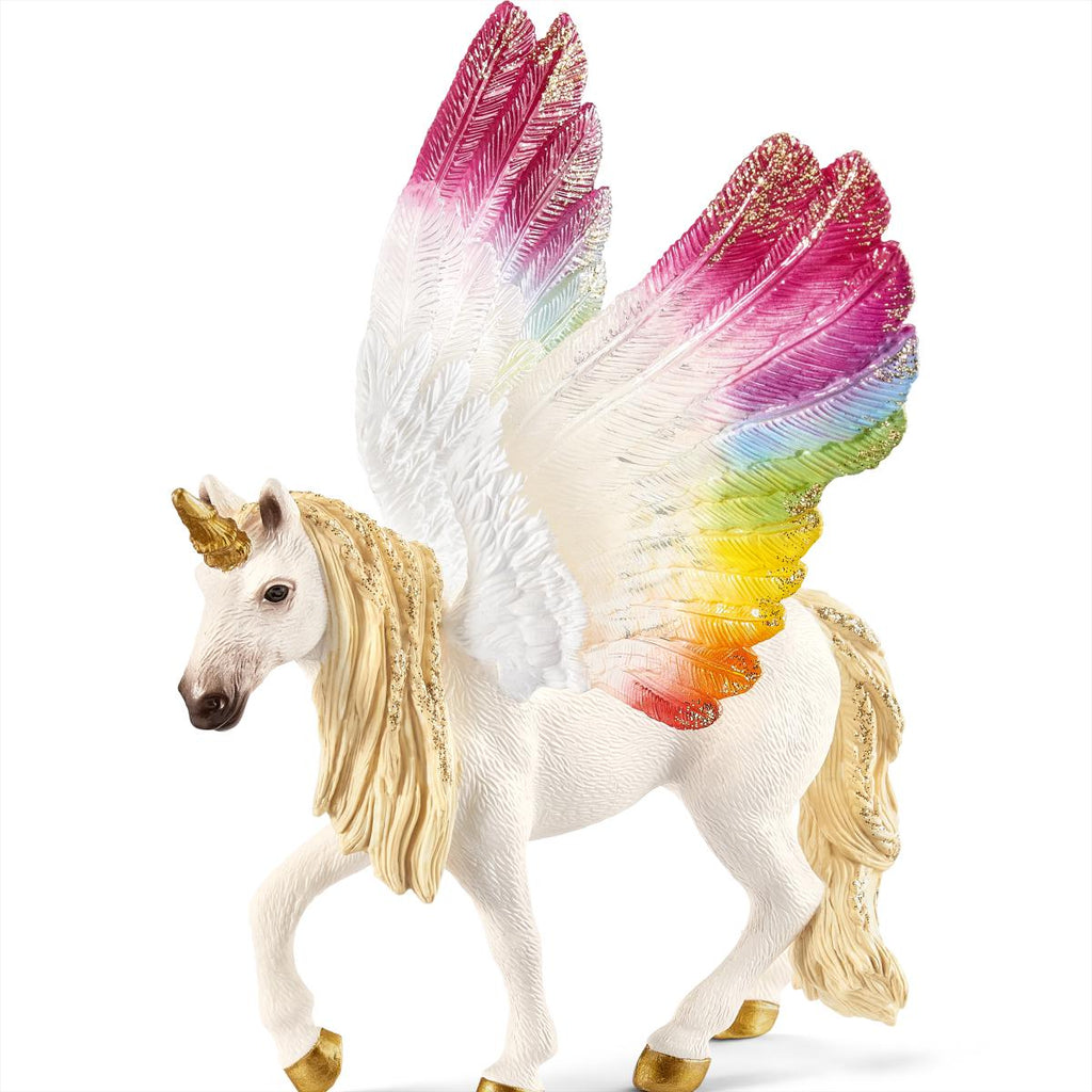 Hidden in the mountains of Rainbow Island, there lives a Pegasus unicorn with its little one. Their wings light up in all colours of the rainbow, even more magnificently than any of the other creatures of this colourful island. The winged rainbow unicorn has recently begun taking along its little one on its wings across the island to the end of the rainbow. The elves there know and love them. Whenever they see them, they clap and cheer for them, and they look forward to the day of the Rainbow Festival. Because then the two of them come to the elves and they celebrate together. It is the most beautiful and colourful festival in all of bayala. Guests come together from all corners to bid welcome to the two wondrous, flying creatures and to behold their beauty and majesty of colour. Do you want to celebrate with them?