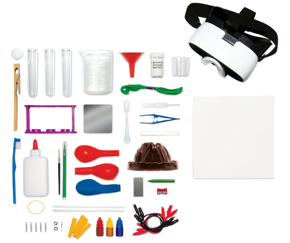 Discover science with Bill Nye "The Science Guy" in this interactive science kit! 50+ piece set includes an 80 page project book loaded with 30 hands-on experiments, including VR goggles that teleport you into Bill's lab in virtual reality!