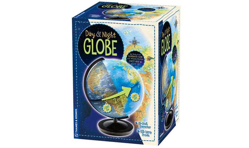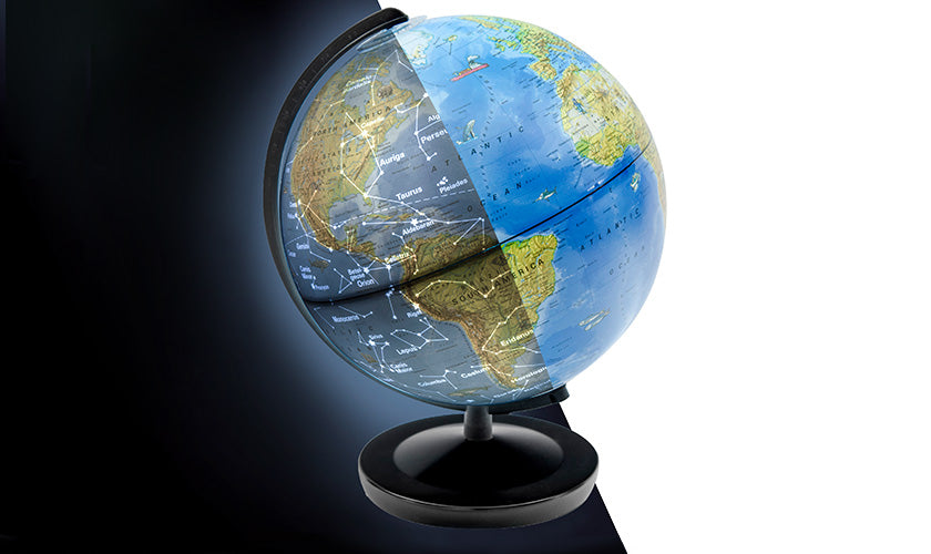 This ten-inch-diameter acrylic globe has a light inside, allowing it to function in two modes. In its non-illuminated day mode, the globe displays a detailed, exquisitely designed physical and political map of Earth. At a glance, you can see country borders, mountains, rivers, and more. When the internal illumination is switched on in night mode, a map image with the most important stars and constellations shines through from the inside, revealing a beautiful representation of the starry sky. A 20-page, full-color manual explains the globe’s features and includes useful information about geography and astronomy. The globe plugs into standard wall outlets and has an on-off switch on the cord.