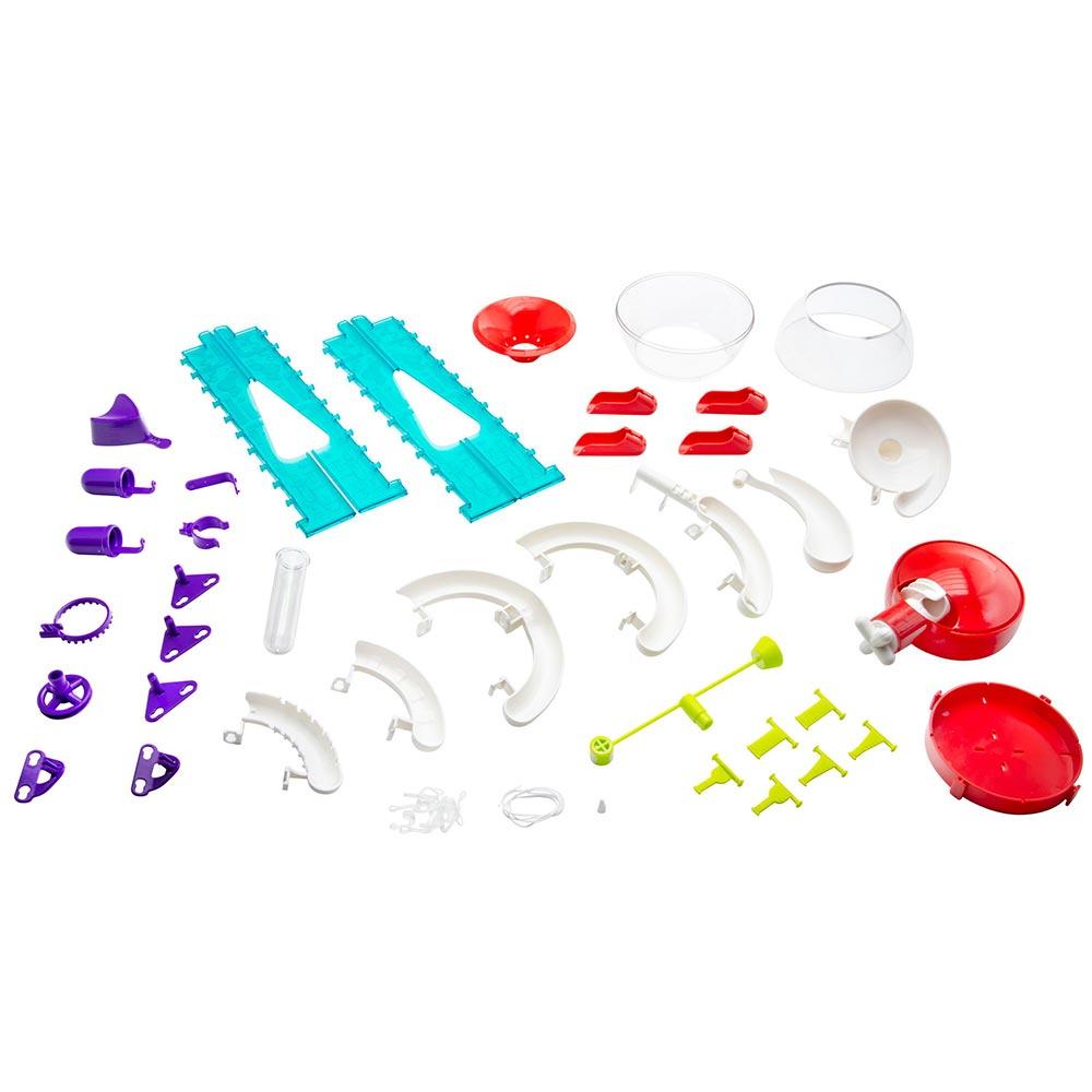 Super sweet stunts! Build your own gumball machines and learn physics lessons in the process. A turn of a handle dispenses one gumball at a time out of the clear storage globe and down the track. The gumballs land in a collection cup and can easily and sanitarily be returned to the globe for another run. The track segments can be moved around on the base to create an almost limitless number of different gumball machines. As the gumballs roll down the track, they perform cool stunts and tricks. Stunts include a pulley lift, pendulum, funnel, trampoline, variable-slope ramp, pinball launcher, and domino slide. Each segment of the track teaches a different lesson in mechanical physics, allowing users to explore topics including simple machines, force, motion, momentum, gravity, Newton’s laws, energy transfer, and more.