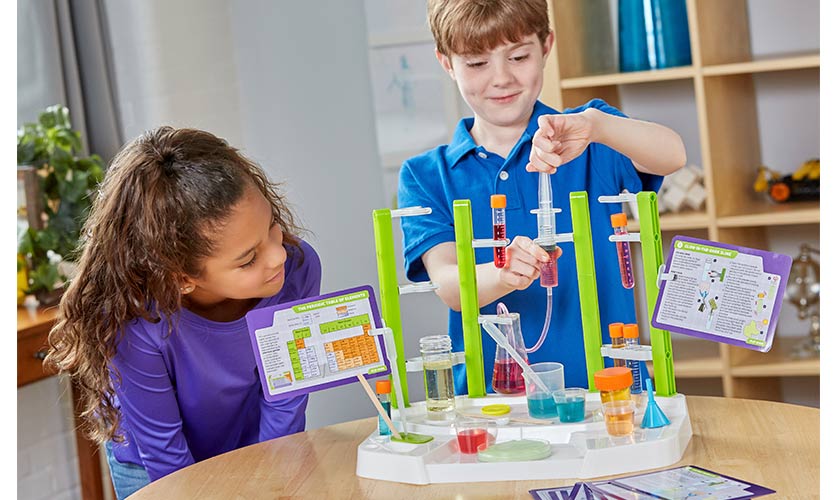 This playful introduction to the basics of chemistry includes approximately 20 experiments. The experiments are presented on printed cards that can be clipped onto the lab station for easy reference. Experiments include glowing slime, color-changing slime, fizzing reactions, oozing bubbles, rainbow in a test tube, chromatography, cabbage juice pH tests, solutions, filtering, crystals, fire extinguisher, and underwater volcano.