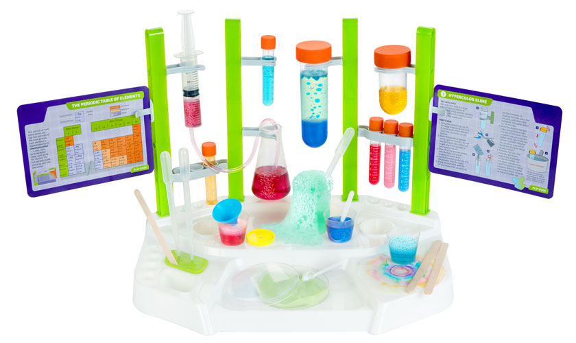 Grab your beakers and test tubes and step up to your special laboratory station for some exciting chemistry experiments. See how much fun chemistry can be as you do slimy, fizzy, colorful, and bubbly experiments. This cool laboratory setup has lots of different vessels and pieces of lab equipment so kids can play the role of chemist while doing real, safe experiments. All of the experiments use non-hazardous chemicals.