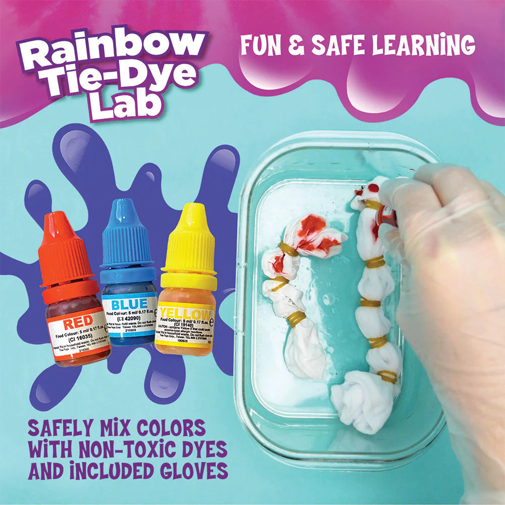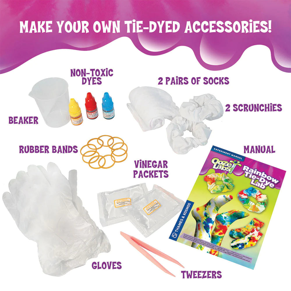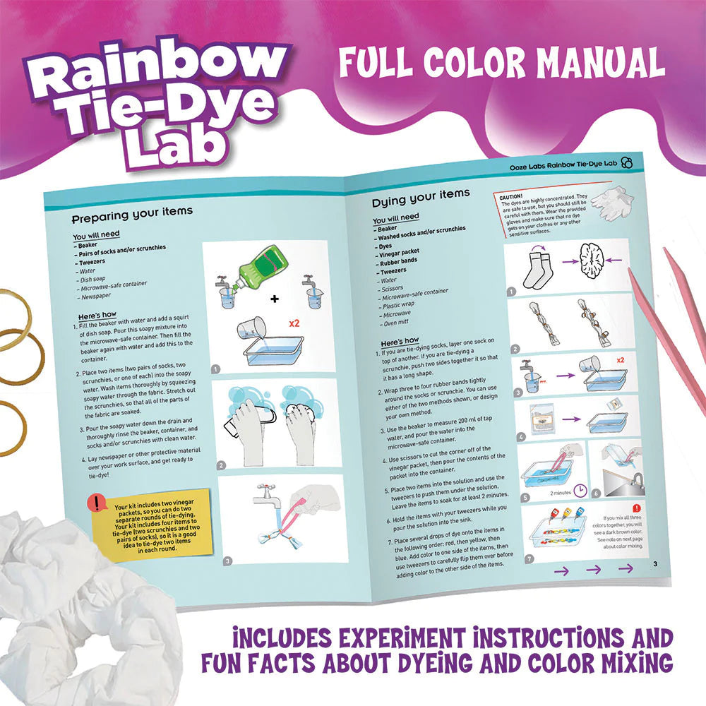 Science meets fashion in this make-your-own tie-dye science lab. Tie-dye two fabric scrunchies and two pairs of socks using non-toxic red, blue, and yellow dyes. Mix them up to create all the colors of the rainbow — red, orange, yellow, green, blue, and purple! A full-color manual guides you through the steps for creating different types of groovy tie-dye patterns. Or invent your own method! Create your dye solution like a scientist by using the included measuring beaker. As you go, learn about the science and art of dyeing fabrics. Explore color mixing and learn about why your eye sees colors. Look fabulous in your new tie-dye gear and feel fabulous about all the knowledge you gained!