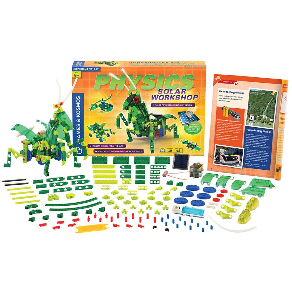 The 142 parts are compatible with other Thames & Kosmos physics and engineering kits. The 48-page book offers illustrated step-by-step instructions for the projects.