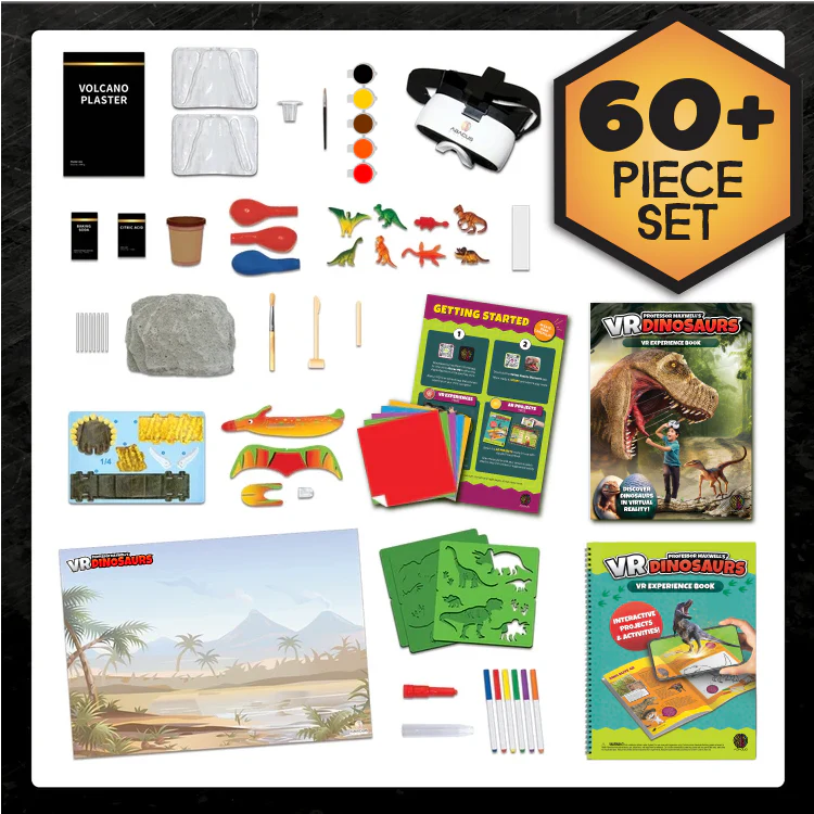 This 60 piece activity set includes a variety of activities, from a 3D stegosaurus puzzle and a dino dig out, to an erupting volcano and blow pen art, this kit includes everything you need to dive in, including VR goggles!