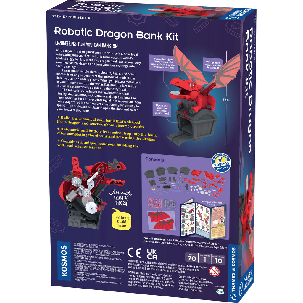 Learn about simple electric circuits, gears, and other mechanisms as you construct the motorized model from durable plastic building pieces. When you place a metal coin in your dragon’s mouth, the wings flap and the jaw snaps shut as it automatically gobbles up the tasty treat.