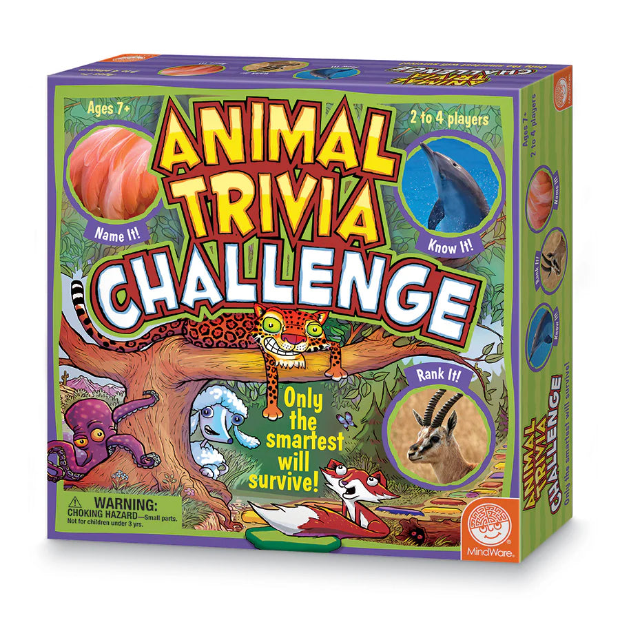 "Which bird eats with its head upside down?" "Can you tell a Seal from a Sea Lion?" "Which animals are the most poisonous?" Players build their animal knowledge through three types of stimulating challenge cards—432 questions in all! Each card is double-sided with an advanced question on one side and a beginner on the other. Players choose a level to play throughout, which helps keep an even playing field when different ages are playing against each other. Each card represents a different color and corresponds to the spaces on the board. "Know It" cards have multiple choice and true/false questions. "Name It" cards require players to identify the animal in the picture shown. "Rank It" cards challenge players to put a list of animals in order based on criteria like size, speed and strength. Each correct answer earns a survival token—but there's a twist. Tokens are worth various point values and players keep in secret how many points they have accumulated until the end of the game! Explore your way around the board but watch out for predators, fire, poisonous berries and quicksand! The winner of the game is the player with the highest point value overall. From family pets to ferocious predators, discover the world's animals with this game the whole family will love!