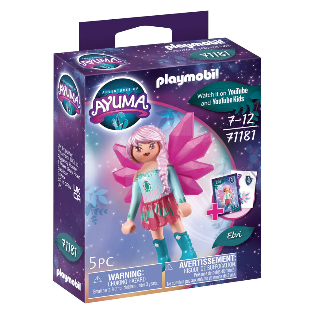 Crystal Fairy Elvi protects the precious energy crystals with her magic. Should intruders want to steal the treasured stones, Elvi can imprison them with her crystal dome spell. Her beloved soul pet butterfly supports Elvi in her important task. With charming characters, magical stories and great effects, the PLAYMOBIL Ayuma play figures invite creative role play. Fantastic fairy fun for children aged 7 and up. The fairy toy consists of Crystal Fairy Elvi as well as a pair of fairy wings to pin on. Also included in the set are stickers and a trading card with cool rainbow effect.