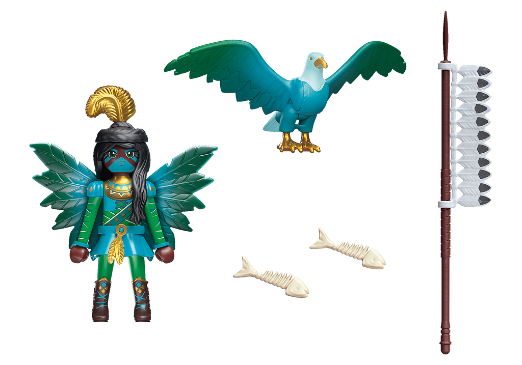 In the mysterious forest, the fairies live together with their soul animals in peaceful harmony. All fairies and their soul animals are united by a very special bond. This blue-green fairy belongs to the clever Knight Fairies. As a faithful companion she has a mystical blue eagle at her side. Together, the two plunge into every adventure. The playset consists of a Knight Fairy with eagle soul animal, feather spear and other extras. Skirt and hair attachment can be removed.