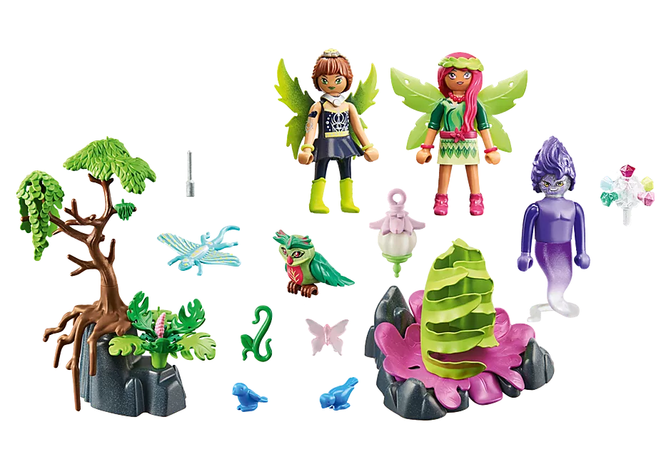 Figures: 1 x Forest Fairy Leavi, 1 x Moon Fairy Starmia, 1 x Mist (purple figure); Animals: 1 x soul animal flying lizard, 1 x soul animal owl, 2 birds, 1 butterfly; accessories: 1 mist trap, 1 tree with magical blossom and blossom lantern, 1 lure crystal with 5 crystal rods, 1 skirt Forest Fairy, 1 corsage, 1 pair of wings Forest Fairy, 1 necklace Forest Fairy, 1 leaf wreath, 1 skirt Moon Fairy, 1 pair of wings Moon Fairy, 1 crown Moon Fairy, 1 necklace Moon Fairy, 4 bracelets