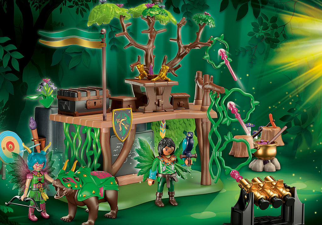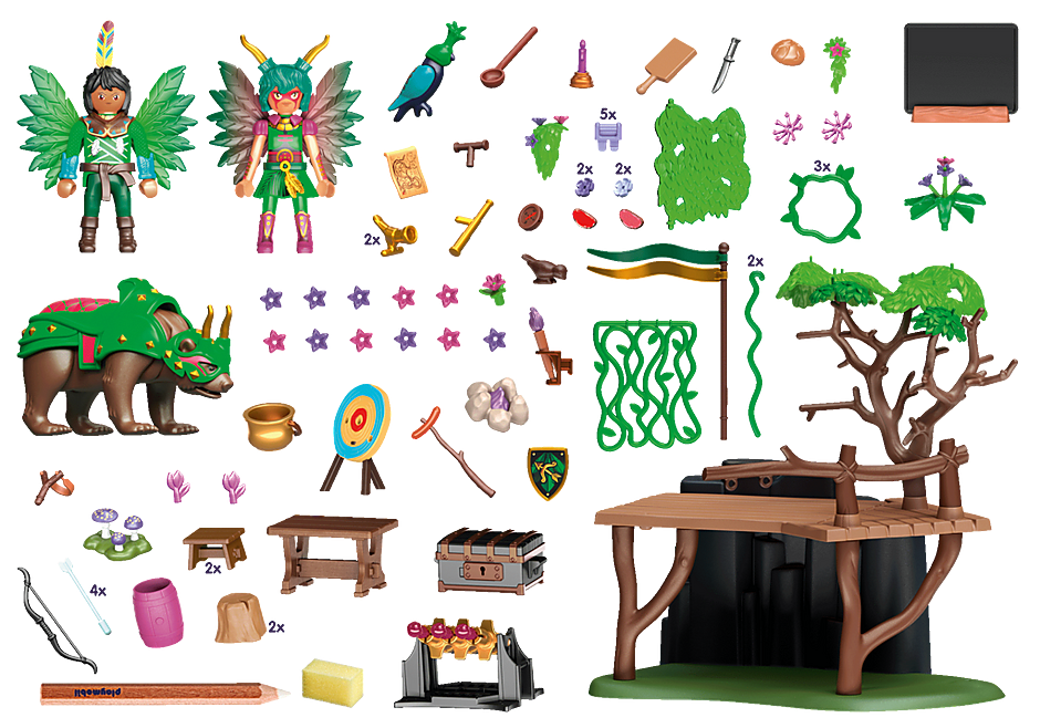 The sinister plans of the dark Bat Fairies put the fairy world in great danger. That's why the Knight Fairies and their magical soul animals are working on their special skills at their Training Camp. On the rocks and on the swinging liana net, they train climbing technique and endurance. To improve their shooting technique, there is a target with bow and arrow and a special fairy cannon. You need a lot of dexterity to shoot the fairy dust projectiles through the liana rings. The fairies record their strategy plans on the blackboard. Thanks to the sponge, they can change and revise their concept again and again. With so much training, there must also be a breather, so the fairies use the wooden platform and treat themselves to a delicious picnic for refreshment. The playset includes a Knight Fairy with Kodiak bear soul animal, a Knight Fairy man with falcon, a Training Camp with picnic platform and climbing rock, a fairy dust cannon with projectiles, a target, bow and arrow, a blackboard and many other exciting extras.