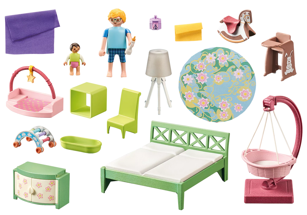 Figures: 1x man, 1x baby; Accessories: 1x double bed, 1x side table, 1x baby hanging bed, 1x floor lamp, 1x rocking horse, 1x carpet, 1x chair, 1x high chair, 2x blankets, 1x changing unit with baby bathtub and various utensils for baby care, 1x baby walker with seesaw function