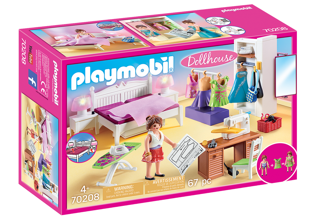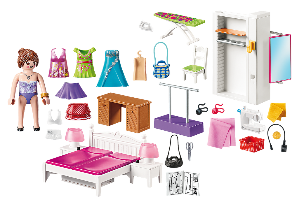 Figures: 1 woman Accessories: 1 double bed with bedside lamps, 1 wardrobe with mirror, 5 coat hangers, 1 sewing table, 1 chair, 1 coat rack, 1 ironing board, 1 iron, 1 sewing machine with foot pedal, 2 fabrics, 2 threads, 1 scissors, 1 pin cushion, 1 pattern, 1 storage box, 1 neckholder top, 1 plate skirt (2-piece), 1 mini skirt (2-piece), 1 dress (2-piece), 1 evening dress (2-piece), 1 neckholder dress (2-piece), 1 bangle, 1 clutch, 1 shoulder bag, 1 handbag