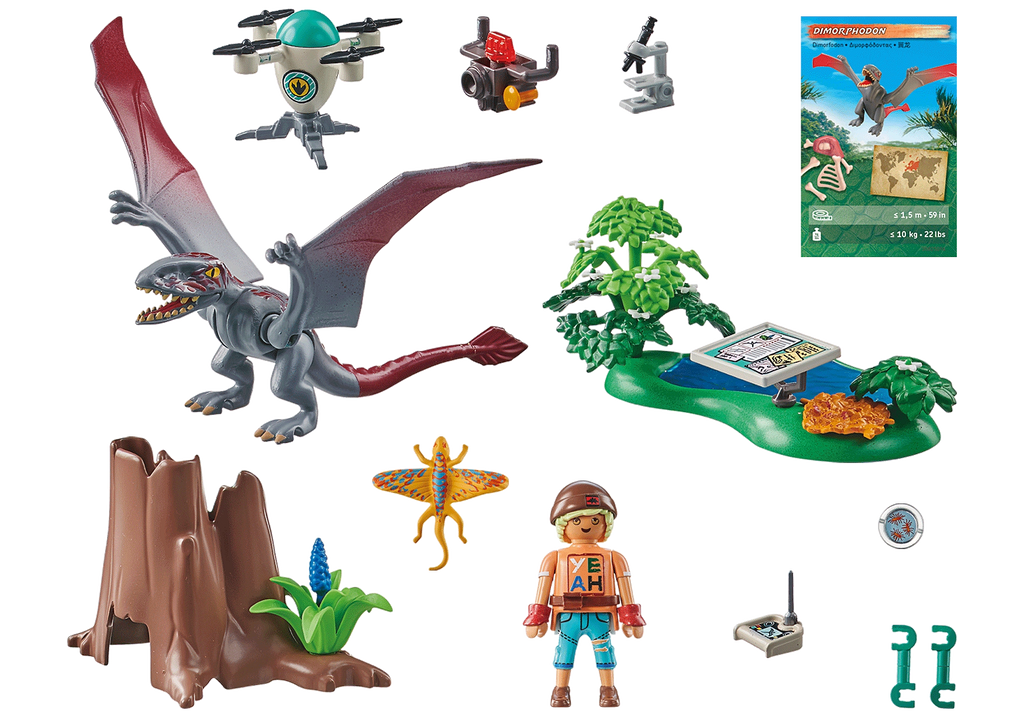Figures: 1 man; Animals: 1 dimorphodon, 1 flying lizard; Accessories: 1 tree stump with plant, 1 pond with plants, 1 microscope with table, 1 petri dish, 1 drone with camera, 1 remote control, 1 cap; 1 dinosaur knowledge card