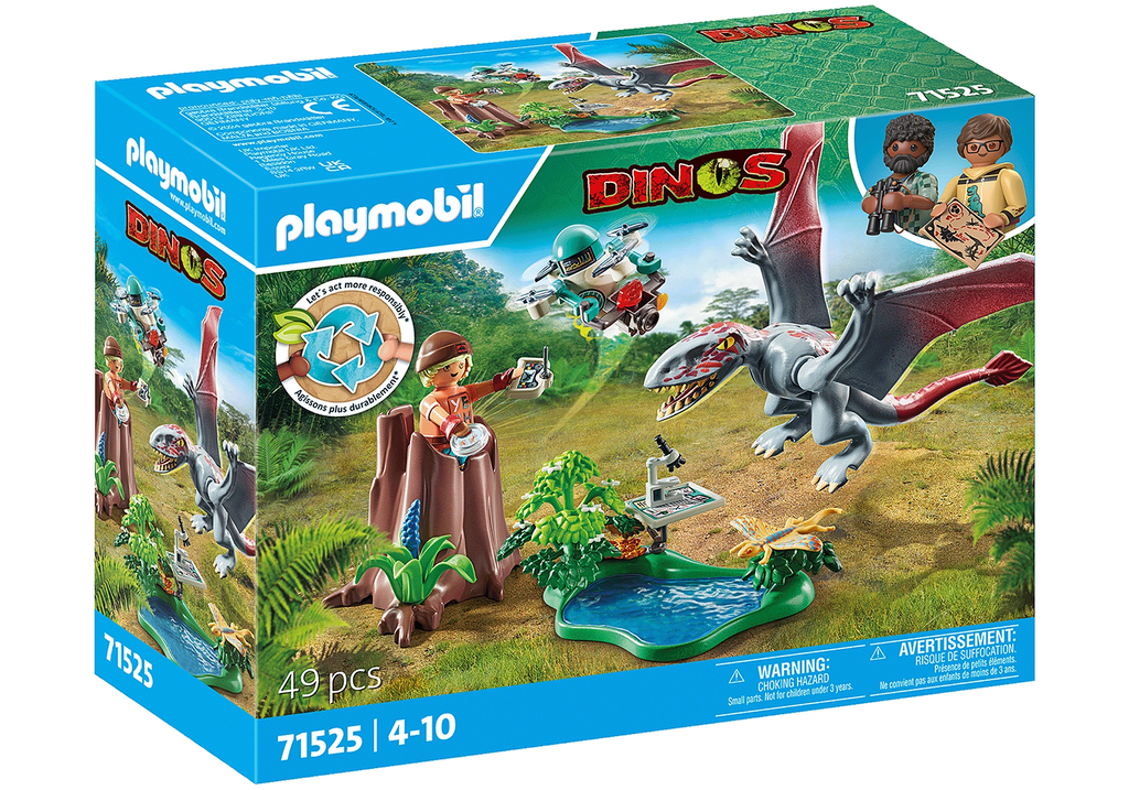 • Cool PLAYMOBIL Dinosaur set featuring a PLAYMOBIL figure, a Dimorphodon, a flying reptile, a drone with a camera, a microscope, a pond with plants, and many other fantastic extras.